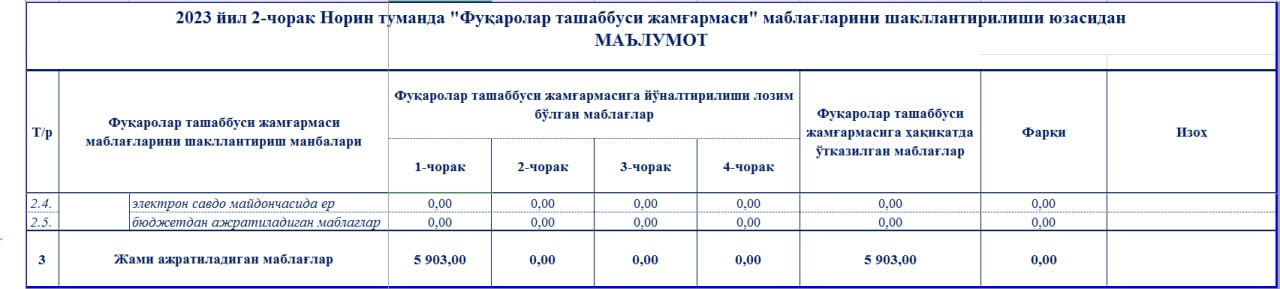 2023 йил 2-чорак Норин туманда "Фуқаролар ташаббуси жамғармаси" маблағларини шакллантирилиши юзасидан МАЪЛУМОТ