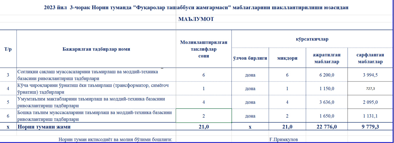 Шунингдек, 14 та муассасаларда 1025,0 тонна кўмир жамғариш режалаштирилган бўлиб, амалда 1025,0 тонна, 100% жамғарилган.