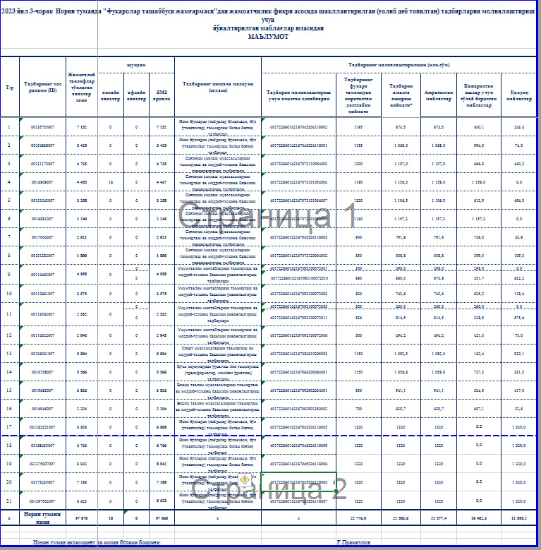 Объектларда ҳисобот кунига қадар қуйидаги ишлар бажарилган: Хусусий шерик, "NORIN GAZ-SEV MONTAJ" МЧЖ, "SIFARLI TARMOQ XIZMAT" МЧЖ, "BUILDING SERVIS INVEST" МЧЖ, 68 та объектлардан 68 тасида (100%) таъмирлаш ишлари тўлиқ якунланган.